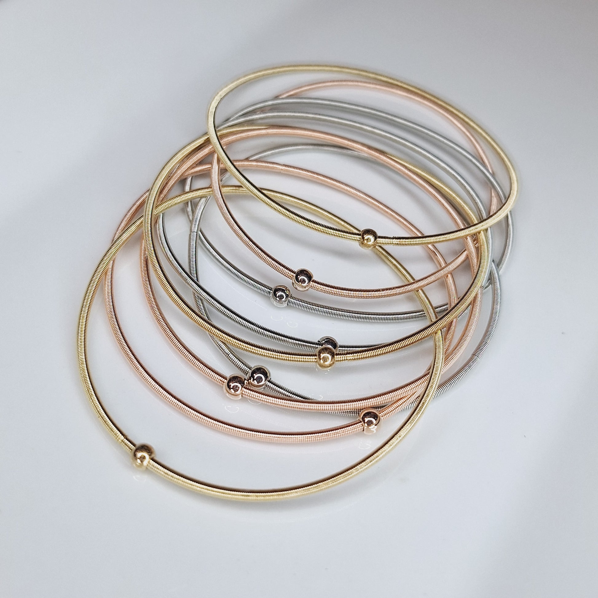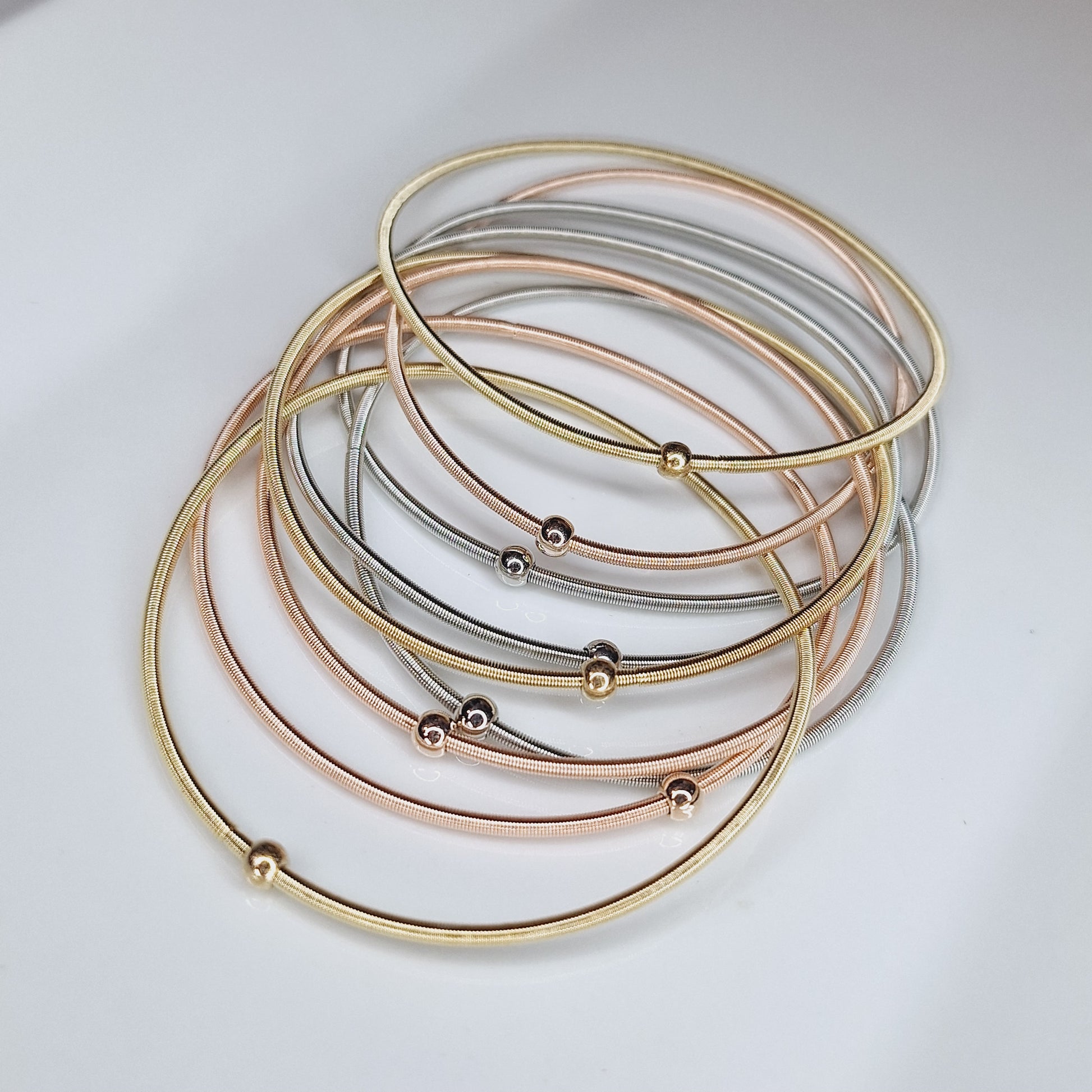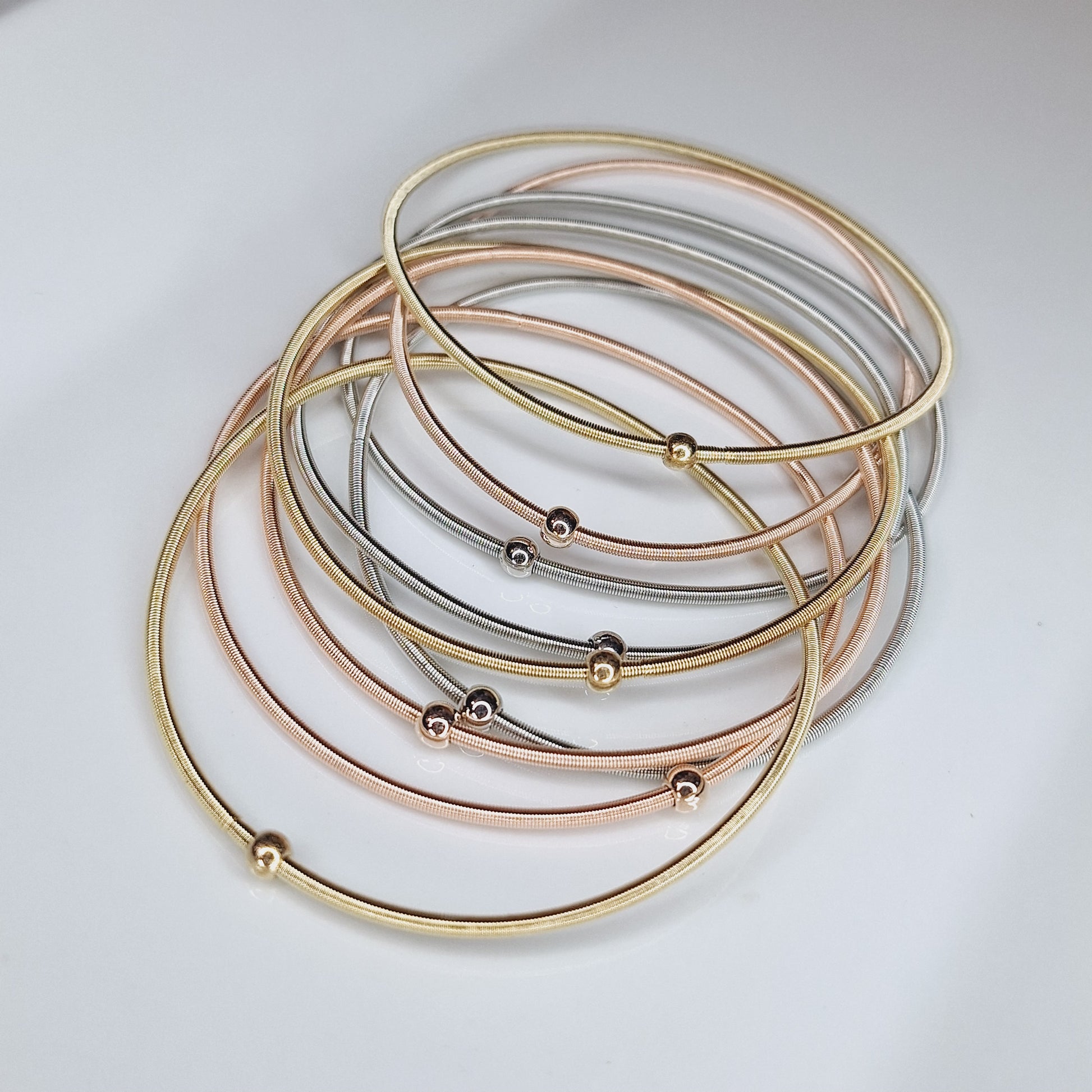 Estas pulseras de resorte son un accesorio de moda imprescindible. Con tres colores disponibles, son únicas y le agregarán un toque de estilo a cualquier atuendo. ¡Haz una declaración de moda con estas pulseras!
