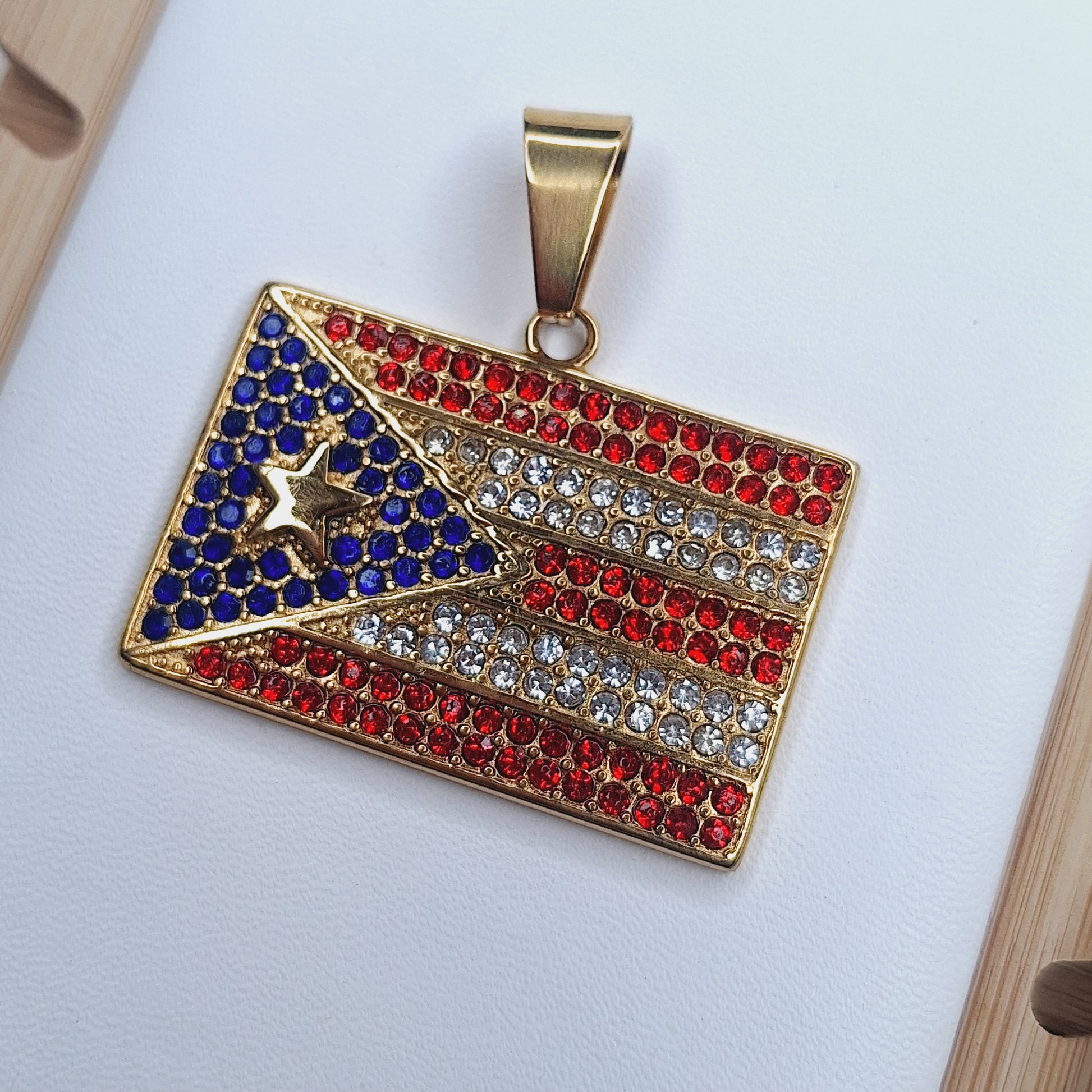 This elegant pendant features vibrant Puerto Rican flag designs, adorned with sparkling zirconia crystals. Made from high-quality stainless steel, it combines fashion and durability. Available for shipping to Puerto Rico and the United States.
